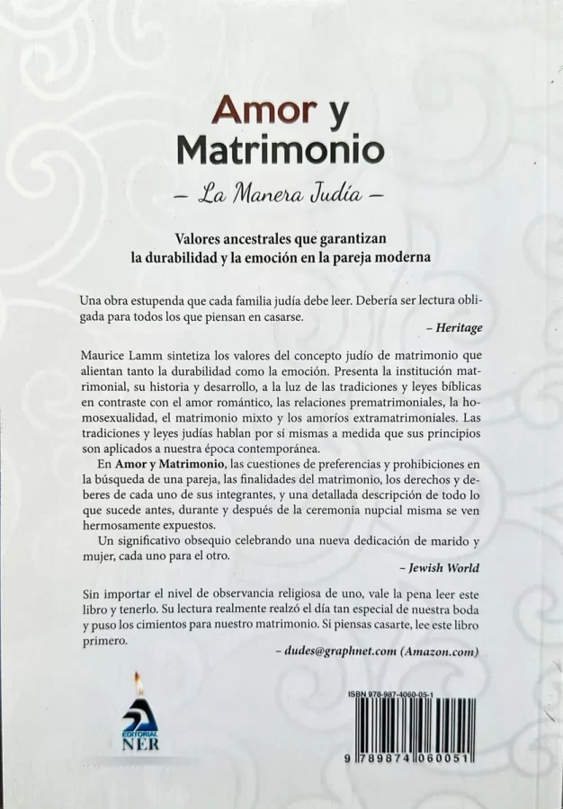 “Maurice Lamm sintetiza los valores del concepto judío de matrimonio que alientan tanto la durabilidad como la emoción. Presenta la institución matrimonial, su historia y desarrollo, a la luz de las tradiciones y leyes bíblicas en contraste con el amor romántico, las relaciones prematrimoniales, la ho-mosexualidad, el matrimonio mixto y los amoríos extramatrimoniales. Las tradiciones y leyes judías hablan por sí mismas a medida que sus principios son aplicados a nuestra época contemporánea.