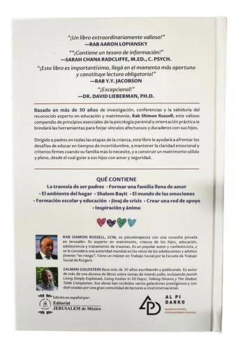 Basado en más de 30 años de investigación, conferencias y la sabiduría del reconocido experto en educación y matrimonio, Rab Shimon Rusell, este valioso compendio de principios esenciales de psicología parental y orientación práctica le brindará las herramientas para forjar vínculos afectuosos y duraderos con sus hijos.