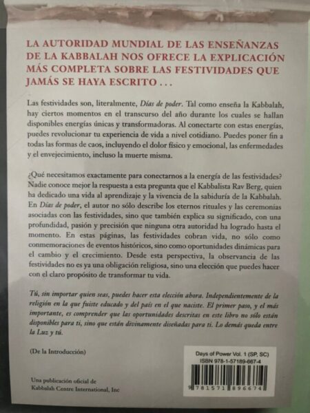 De acuerdo con la Kabbalah, las festividades, las lunas nuevas y los aniversarios de muerte de almas iluminadas son tiempos cósmicos para acceder a energías transformadoras. Cada mes presenta un desafío para conectar con bendiciones únicas. En Días de poder, Rav Berg describe la energía espiritual disponible con cada festvidad, y explica su importancia a profundidad, con precisión y pasión. Lo que nos ofrece una conciencia que podemos utilizar para llenar nuestra vida de positividad