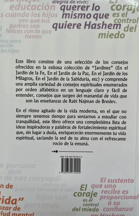 Este libro consiste de una selección de los consejos ofrecidos en la exitosa colección de “Jardines” (En el Jardín de la Fe, En el Jardín de la Paz, En el Jardín de los Milagros, En el Jardín de la Sabiduría, etc) y comprende una amplia variedad de consejos espirituales enumerados por orden alfabético en un lenguaje claro y fácil de entender, consejos que surgen del manantial de vida que son las enseñanzas de Rabí Najman de Breslev.