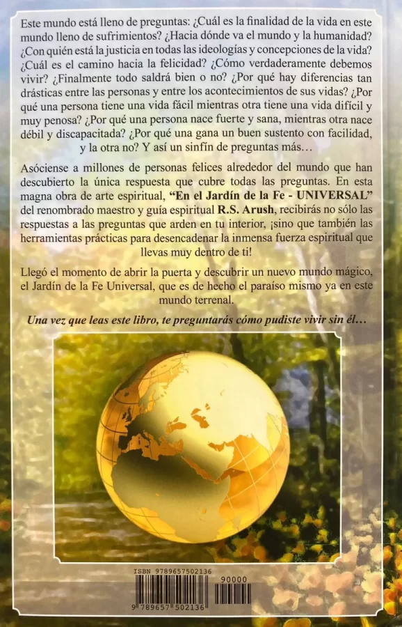 Asóciese a millones de personas felices alrededor del mundo que han descubierto la única respuesta que cubre todas las preguntas. En esta magna obra de arte espiritual, “En el Jardín de la Fe – UNIVERSAL” del renombrado maestro y guía espiritual R.S. Arush, recibirás no sólo las respuestas a las preguntas que arden en tu interior, ¡sino que también las herramientas prácticas para desencadenar la inmensa fuerza espiritual que llevas muy dentro de ti!