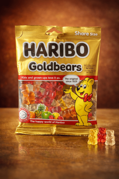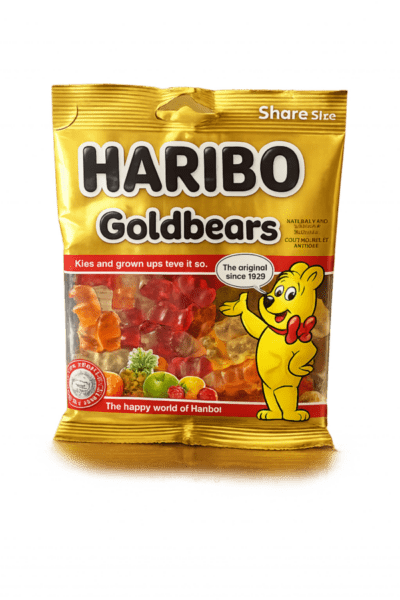 Haribo Goldbears Share Size son gomitas clásicas con forma de ositos, elaboradas con gelatina y una mezcla de sabores frutales. Vienen en una bolsa ideal para compartir, con ositos de colores surtidos y textura suave y masticable. Este producto de Haribo, famoso desde 1922, es un dulce popular tanto para niños como para adultos.
