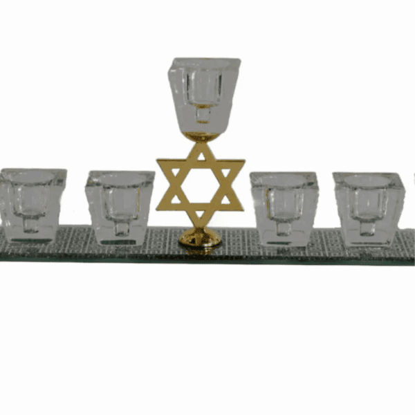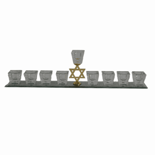 Celebra el milagro de Janucá con esta elegante Janukia de cristal que destaca por su hermosa base y acompañada de la Maguen David. Cada brazo de la Janukiá está cuidadosamente trabajado en cristal de alta calidad, reflejando la luz de cada vela y creando un brillo especial que iluminará tu hogar durante toda la festividad. Esta Januquilla esta llena de significado y ademas aporta un toque de sofisticación convirtiéndola en una pieza decorativa única y significativa.