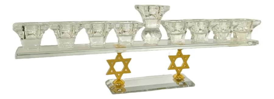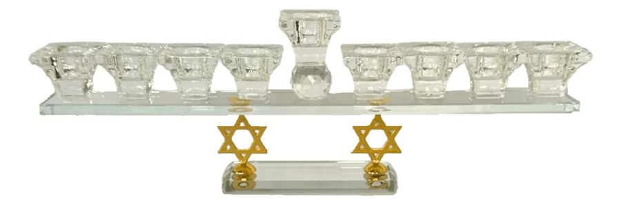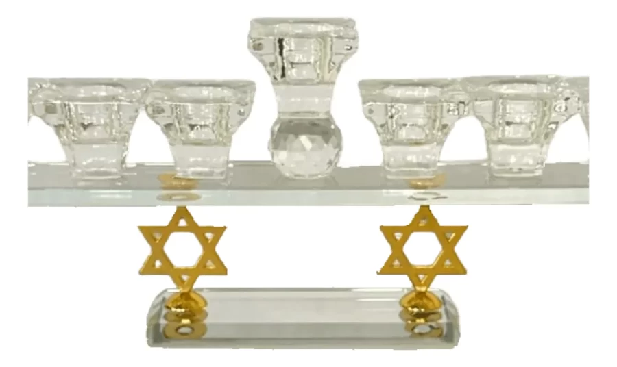 Celebra el milagro de Janucá con esta elegante Janukia de cristal que destaca por sus hermosas bases en forma de Maguen David. Cada brazo de la Janukiá está cuidadosamente trabajado en cristal de alta calidad, reflejando la luz de cada vela y creando un brillo especial que iluminará tu hogar durante toda la festividad. Esta Januquilla aporta un toque de sofisticación, modernidad y simbolismo, convirtiéndola en una pieza decorativa única y significativa. Esta Janukiá es perfecta tanto para quienes aprecian el estilo con un toque moderno, como para quienes buscan un objeto que honre la festividad. Material: Cristal de alta calidad. Diseño elegante y moderno