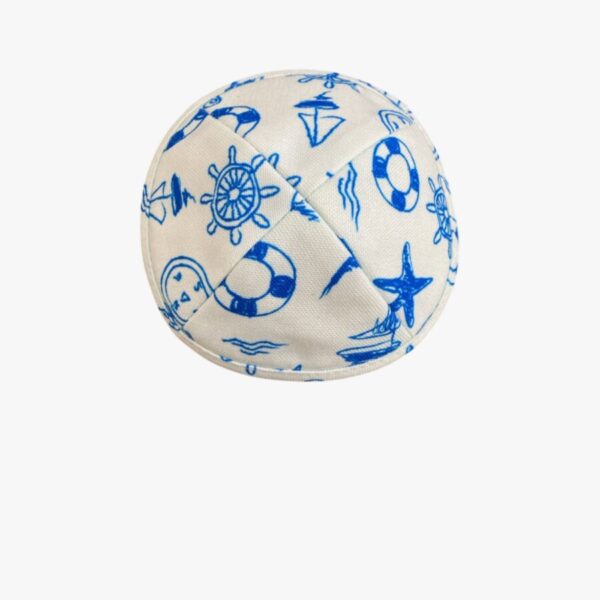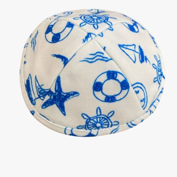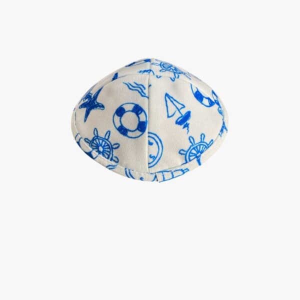kipa de tela blanca con grabados acuáticos diseñada especialmente para niños Cada kipa está elaborada con un material suave y lujoso que proporciona comodidad y un ajuste perfecto, ideal para cualquier ocasión, ya sea una Festividad, Shabat o un dia Jhol.