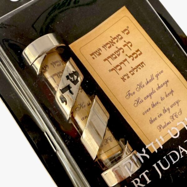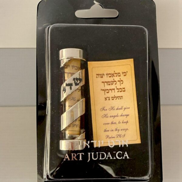 Mezuzá para automóvil es un amuleto protector tradicional,pequeño (aprox. 6 cm), que contiene la oración del viajero (Tefilat Haderech), diseñado para bendecir y proteger al conductor. Se coloca comúnmente en el tablero o interior de la puerta con adhesivo, sin requerir las bendiciones formales de una mezuzá de casa.