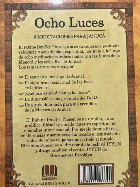 Esta obra nos guia a lo largo de ocho meditaciones relacionadas con las Luces de la Menora y los ocho dias de Januca. en forma general los temas se dividen de la siguiente forma: 1- El sentido y el mensaje de Januca, 2- El significado espiritual de las luces de la Menora 3- ¿Que nos esta diciendo las luces? 4- La dimension mas profunda del Dreidel (Perinola) 5 – Una guia detallada para el encendido de la Menora de Januka